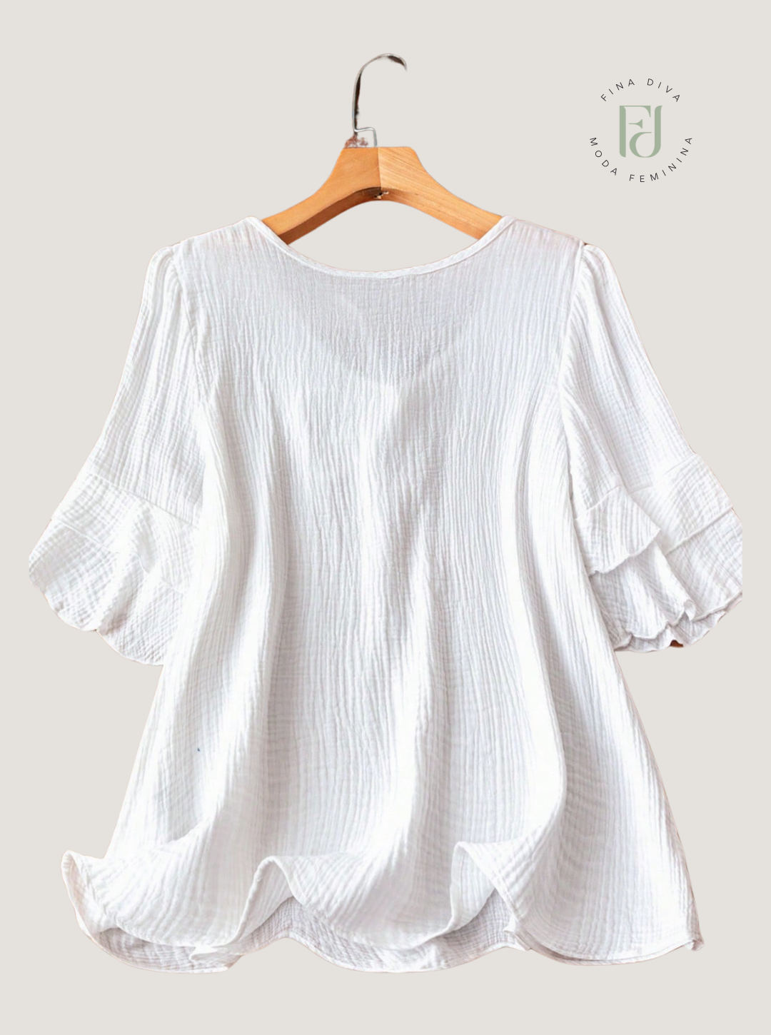 A blusa Braga é feita em algodão e tem caimento soltinho, perfeita para dias de conforto com estilo. 🤍