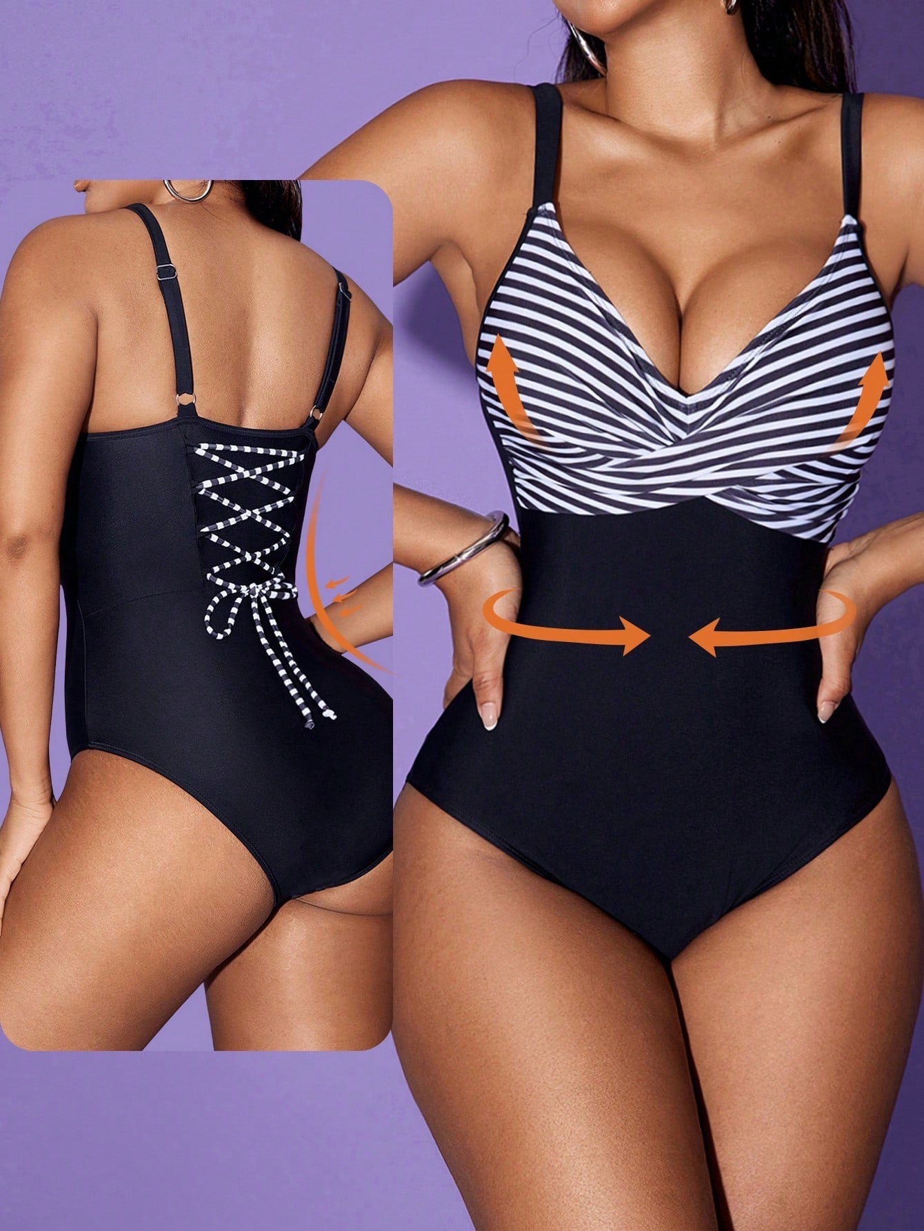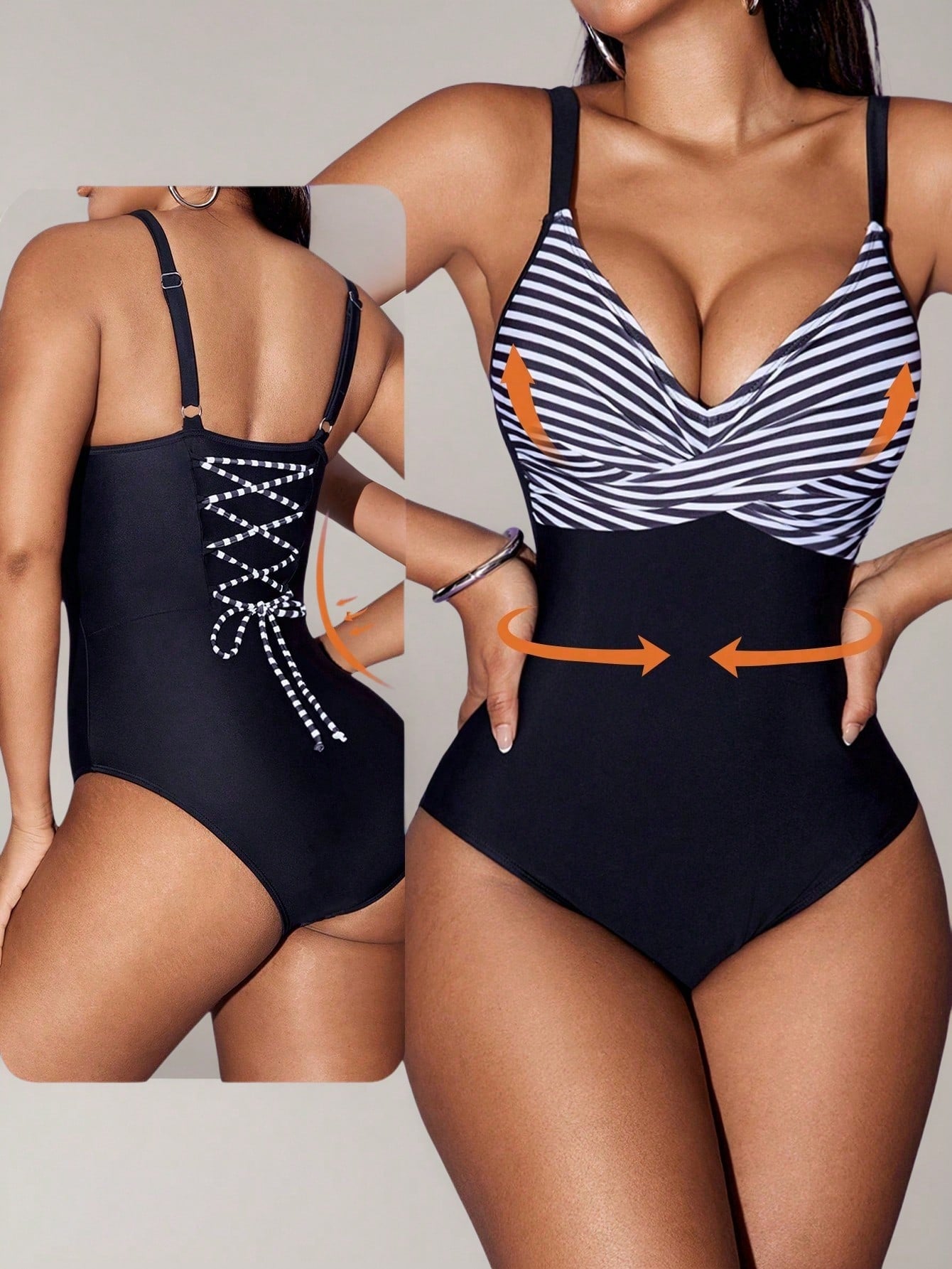 - Detalhes de ziguezague e amarração que valorizam o corpo