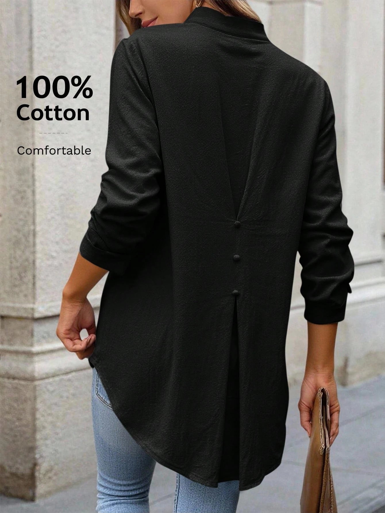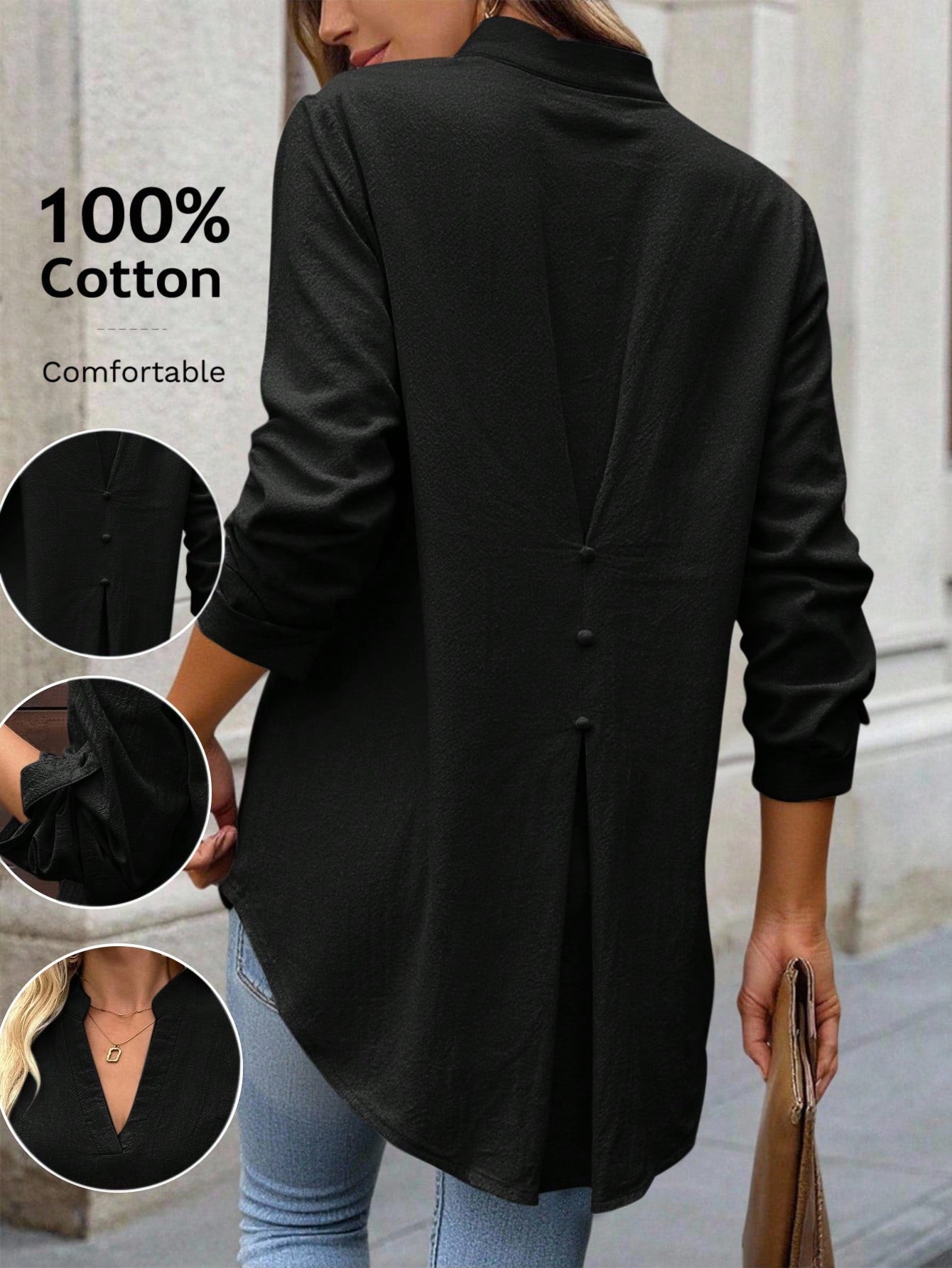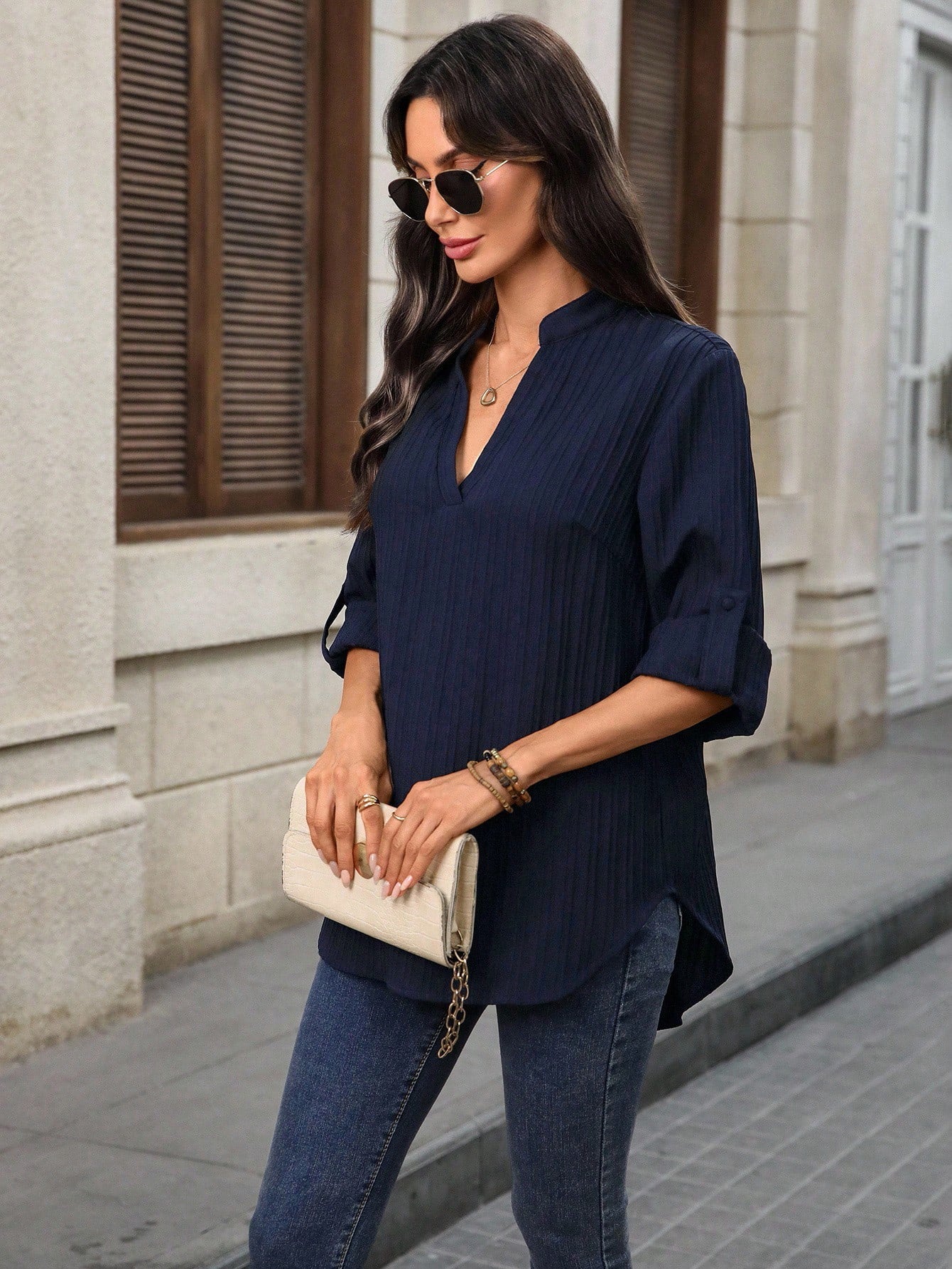 Camisa Solta Feminina com Gola V e Mangas Enroladas - Rosalie