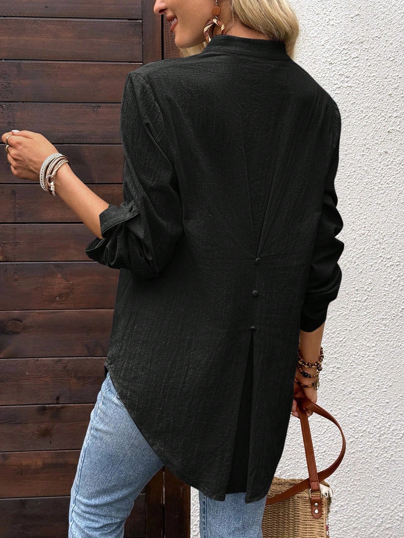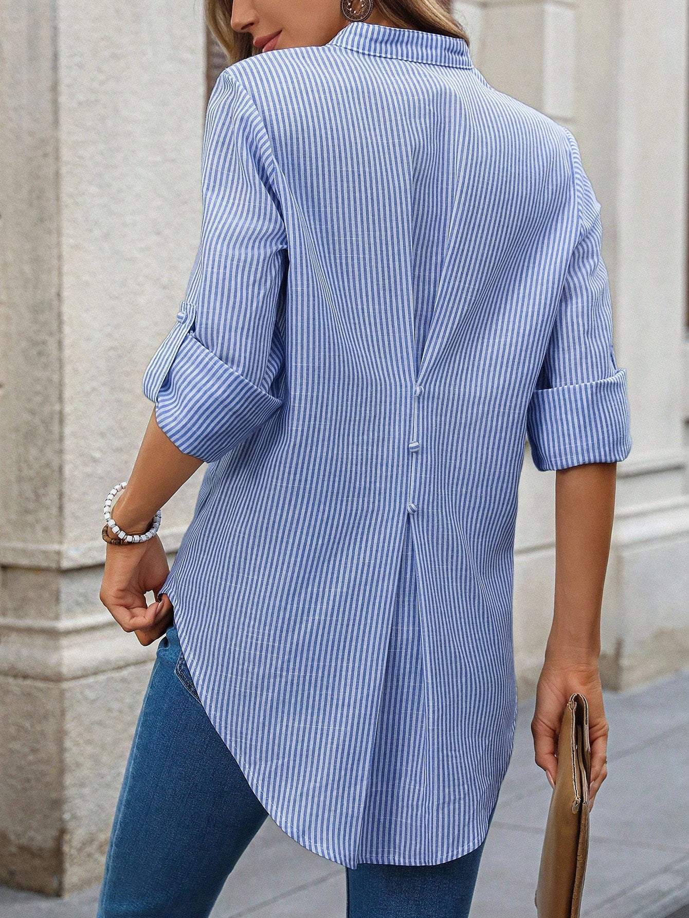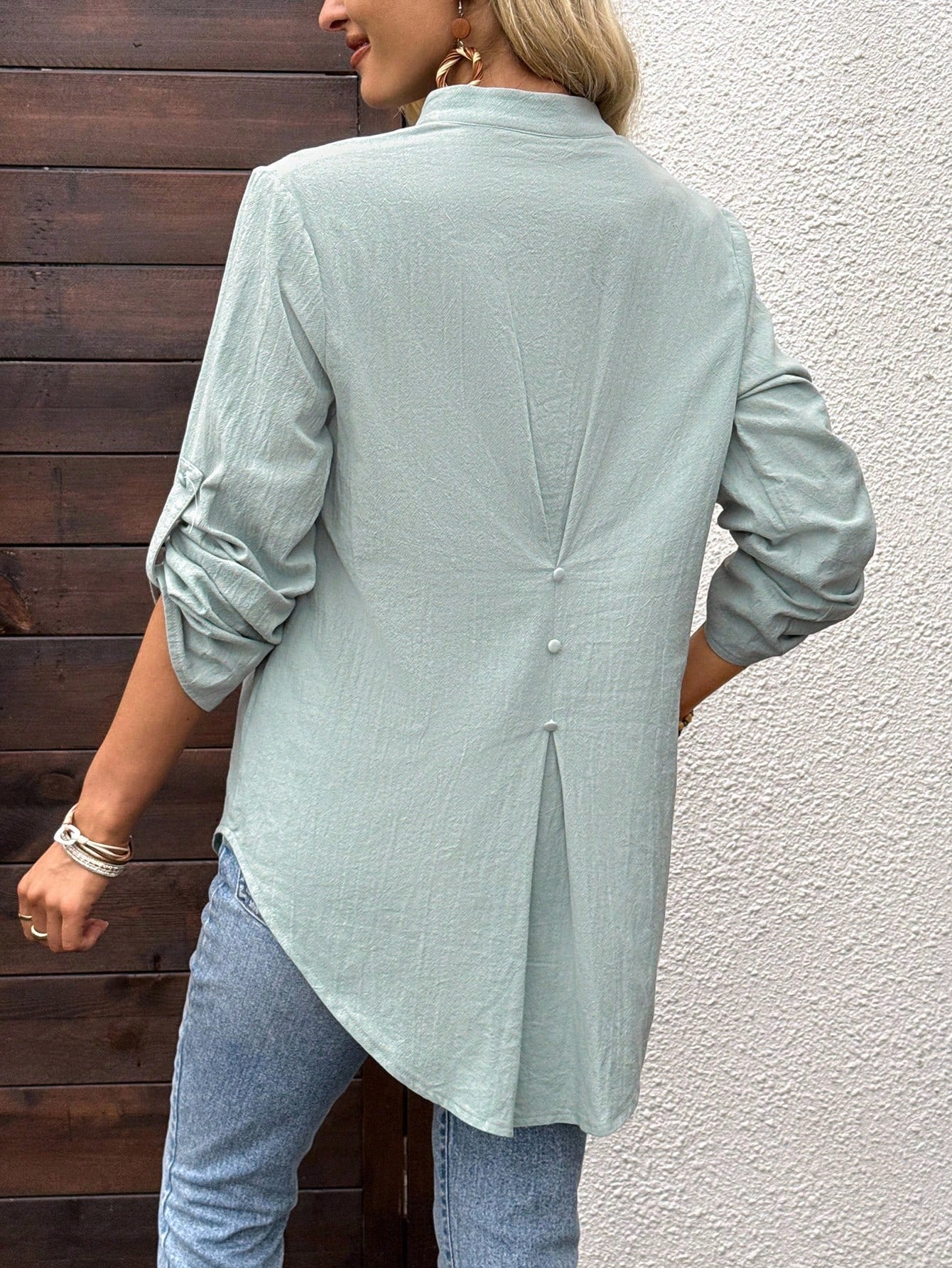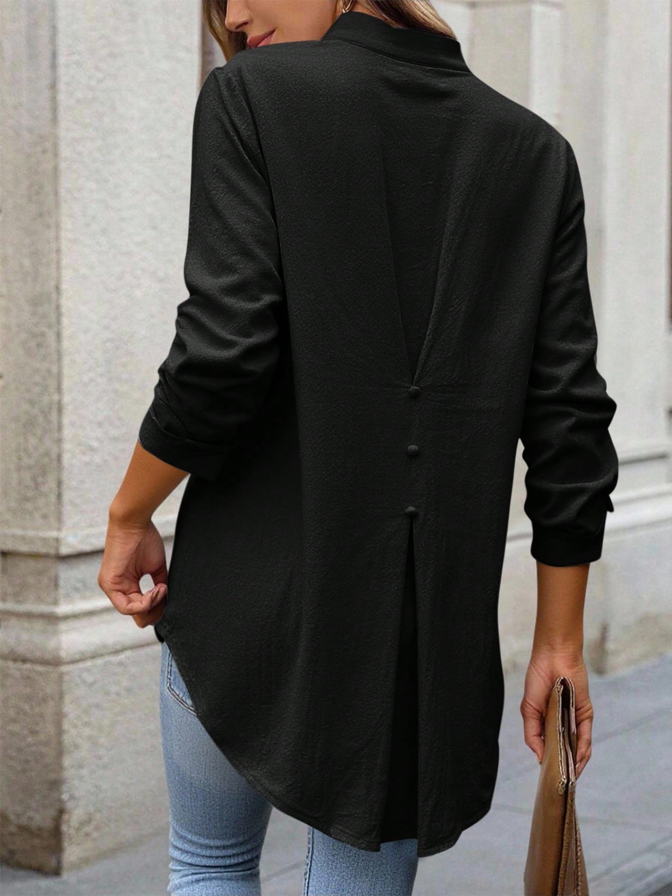 Camisa Solta Feminina com Gola V e Mangas Enroladas - Rosalie